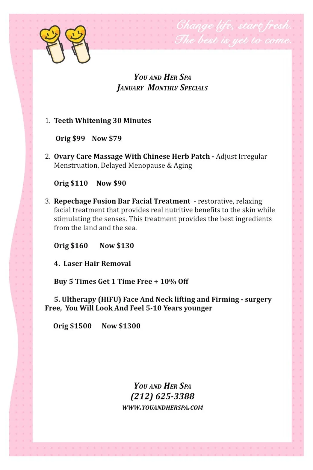 HAPPY NEW YEAR! The spa is buzzing with excitement and new year’s resolutions. Our resolution is…to see you here more (teehee)! Man, is it cold th0ugh… You look like you need a nice, relaxing, warm spa day soon with all this frost. And of course, as usual, this month we have some special deals for our new and loyal customers!